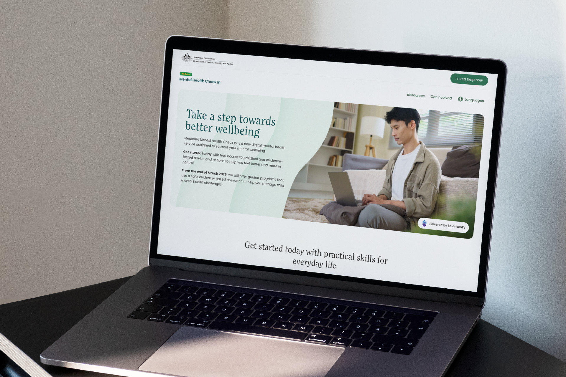 Medicare Mental Health Check In is part of the broader Medicare Mental Health service offering. Previously we worked with the department on the overall brand strategy and identity for Medicare Mental Health, creating a cohesive sub-brand that reduces fragmentation and reflects a commitment to a welcoming, calming and accessible support.