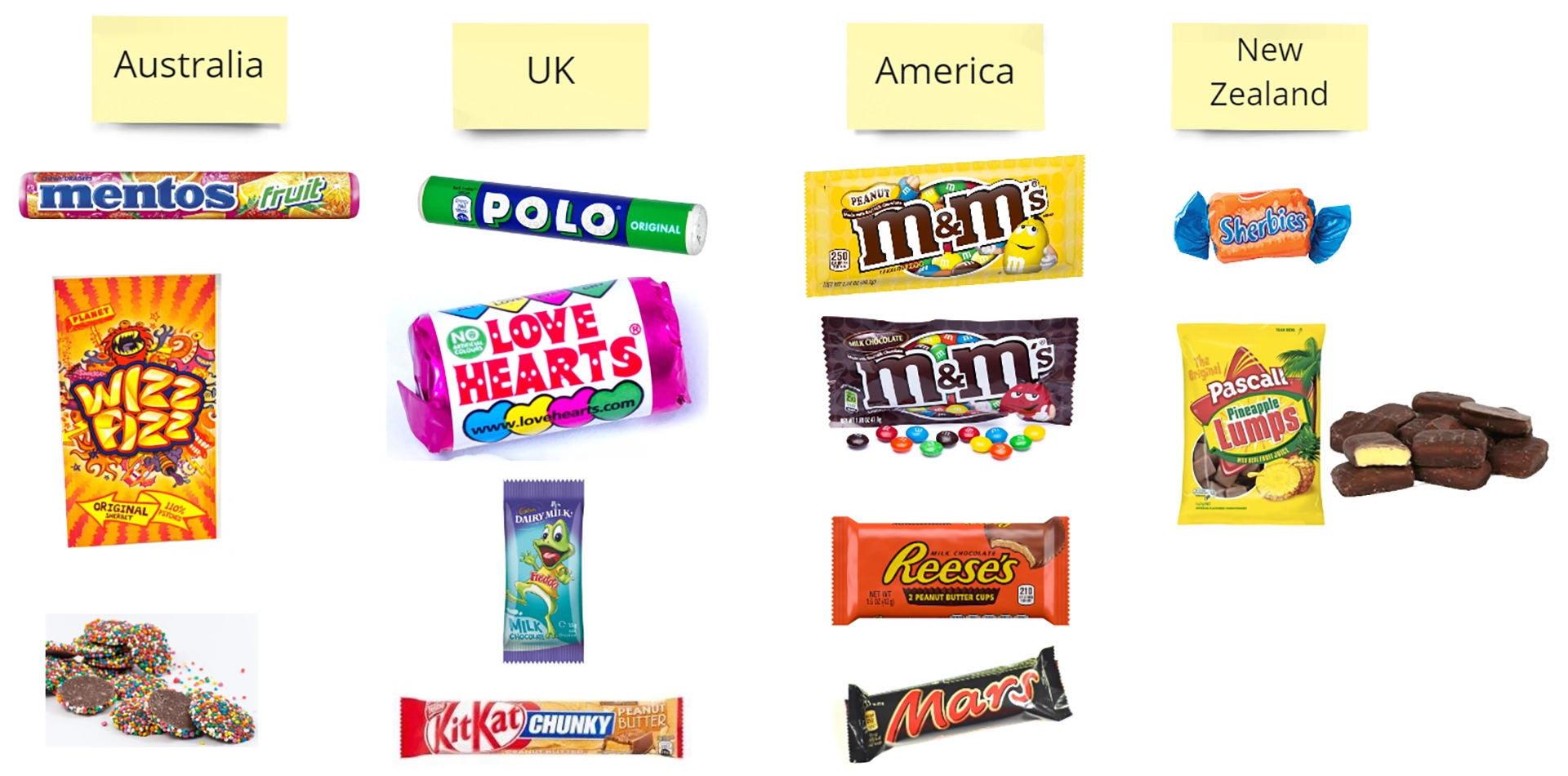 Tasks 2 and 3 were ‘closed sorts’ meaning that categories had already been defined, so our lollies (or topics) only had a few places where they might belong. This type of sort is more rigid and can be quick to expose any flaws with categories. We sorted first by categories, and then by countries. The results of our category sort surfaced more similarities than the previous task, and the country sort had us heading to Wikipedia – who knew that Chupa Chups were from Spain?