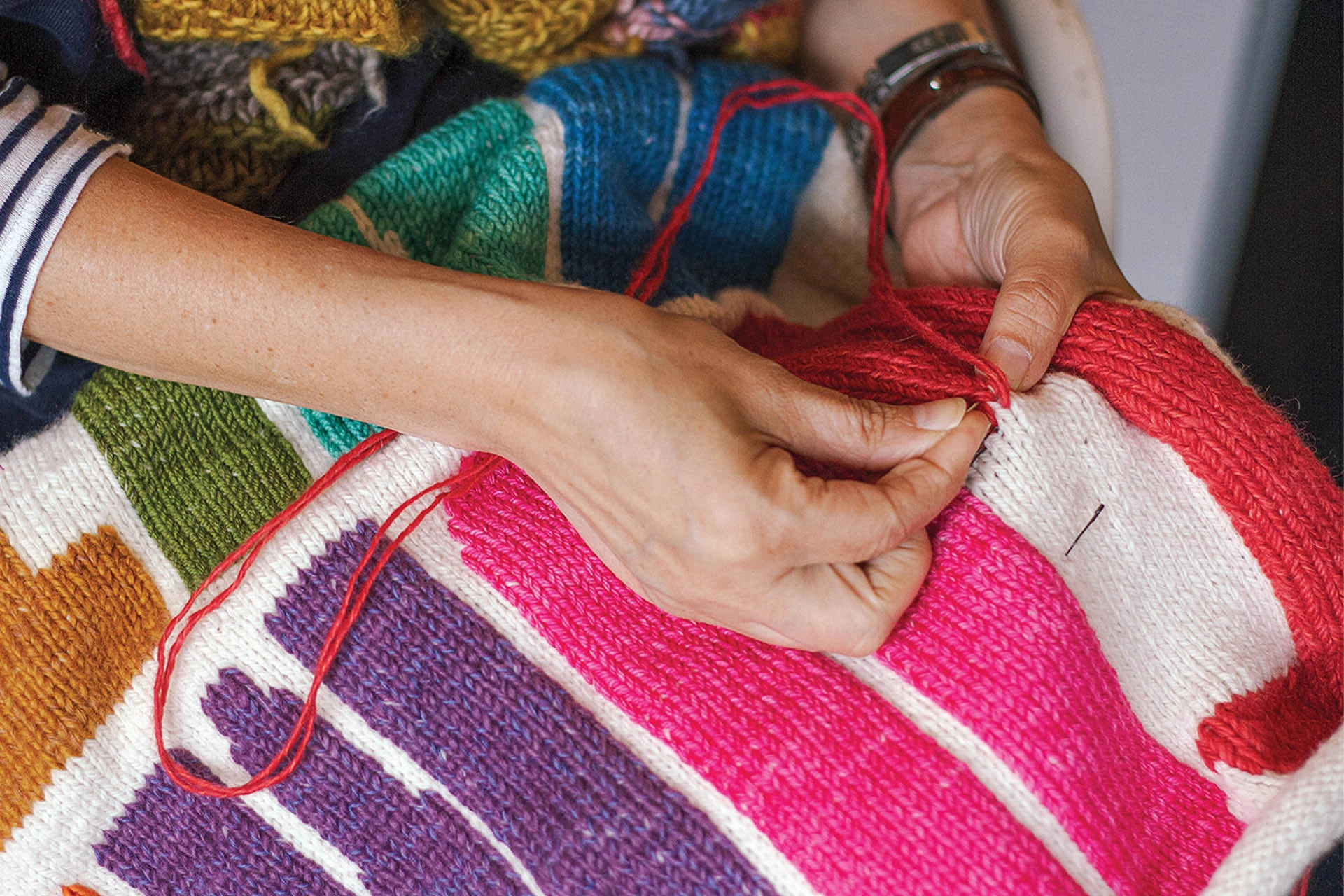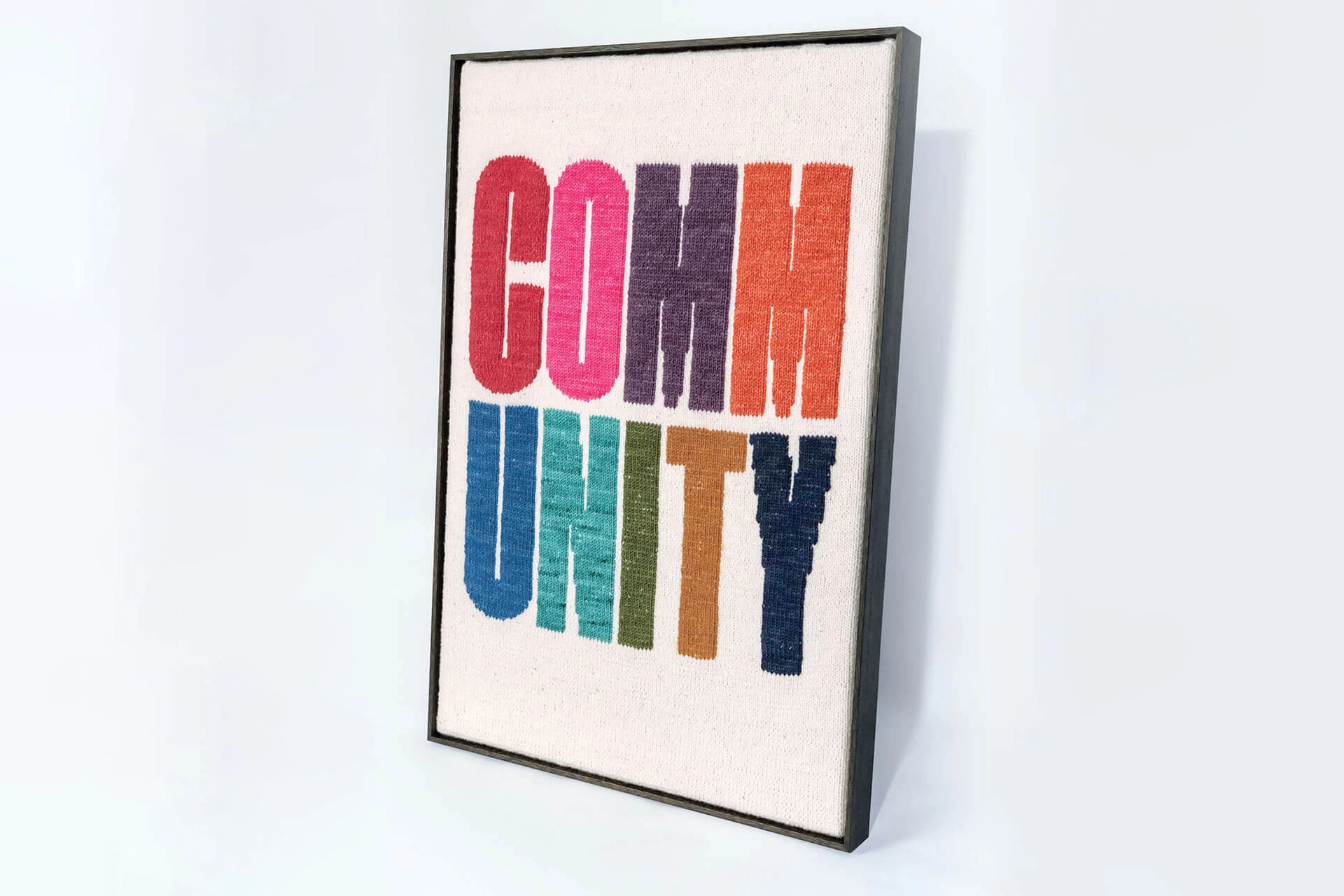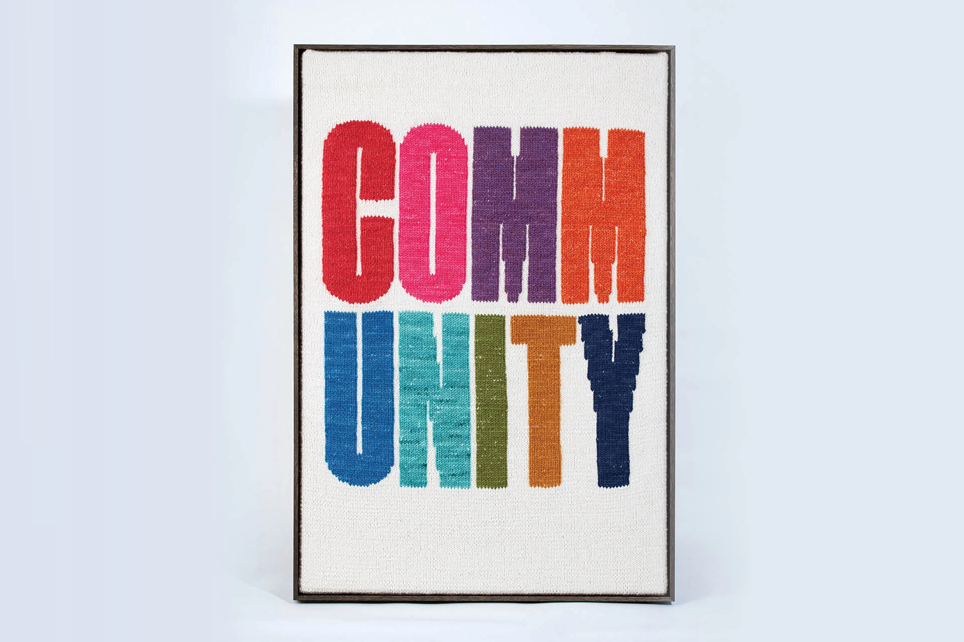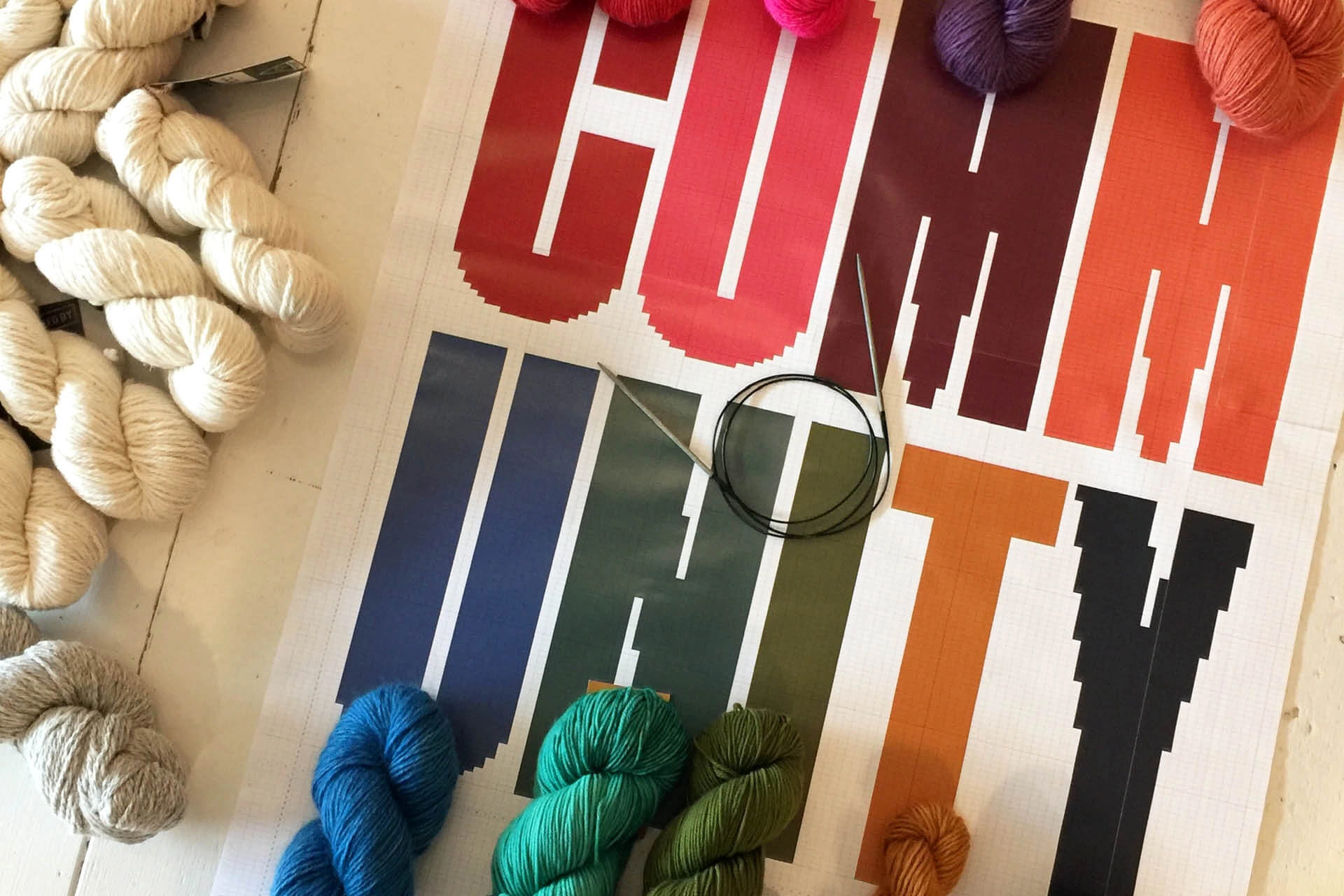 Ten different colours of hand-dyed, 100% wool spell COMMUNITY.