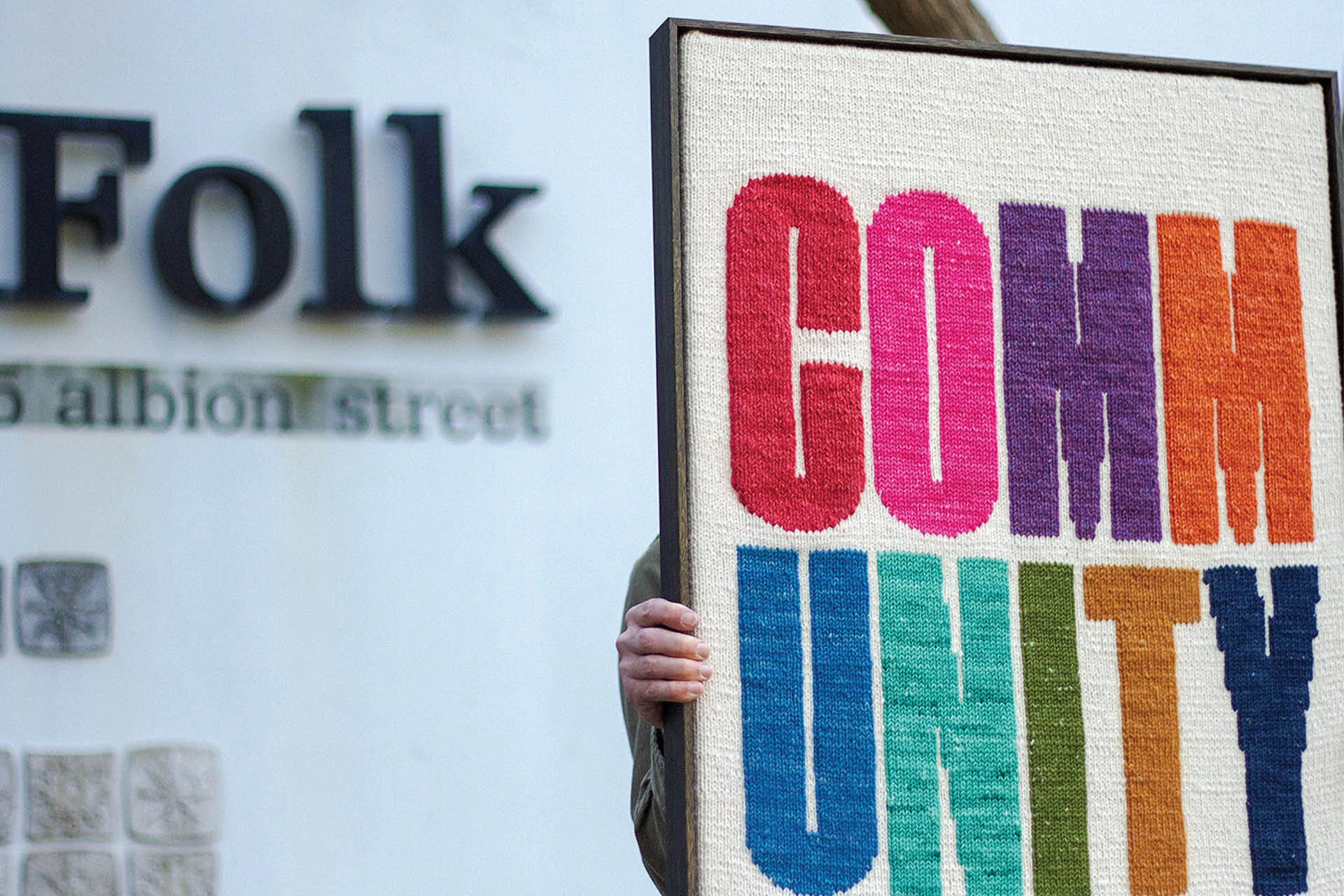 Tests were done. Wool ply and colours chosen. We designed the pattern for Tash to lovingly create the finished poster, by hand. It was then boxed-framed (also just around the corner from Folk) and posted to SF.