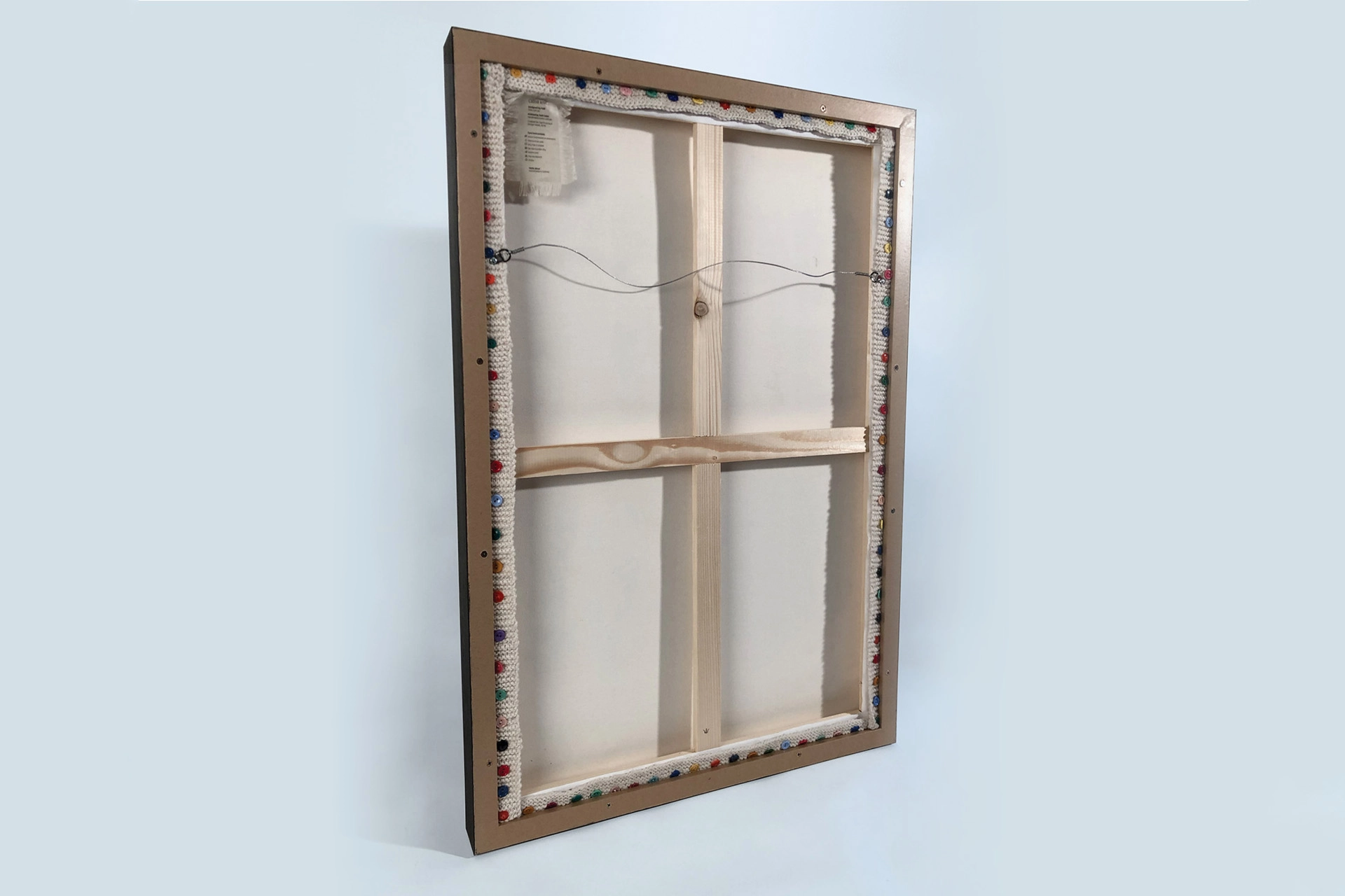 Being wool, the poster can be washed. It’s affixed to its frame with 86 antique different coloured buttons. Care Instructions and all.